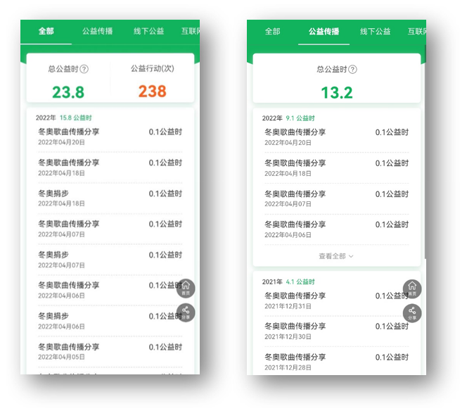 在理学院志愿者组织的积极宣传与号召下,理学院多名同学参与了“绿动冬奥”活动,理学院全体师生以分享歌曲以及捐步的形式积极参与此次“绿动冬奥”活动,在贡献公益时长的同时也能锻炼身体,体现了绿色、共享的理念,同时也为山区孩子修建阳光跑道等公益奉献了自己的力量,具有深刻的意义。