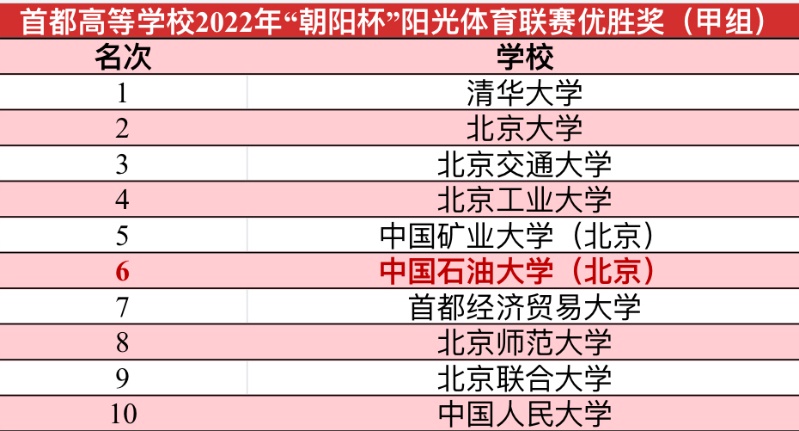 3月11日,北京市大学生体育协会第六届四次理事(扩大)会议顺利召开,我校体育与人文艺术学院相关代表参加了此次会议。本次会议总结了过去一年北京市大学生体育活动的整体工作,表彰了阳光体育联赛优胜学校,我校包揽了2022年首都高等学校阳光体育“朝阳杯”和“阳光杯”全部荣誉。为促进首都高校体育工作,北京市教委设立了“朝阳杯”与“阳光杯”两个奖项。我校在首都高等学校2022年“朝阳杯”阳光体育联赛中积分得792分,获得甲组第六名。在“阳光杯“中积分得1279分,获得第九名。近年来,我校落实立德树人根本任务,将体育课堂教学与校内外群体竞赛相结合,积极推动各项大学生体育赛事,构建校园群体竞赛新体系,促进课程、社团、代表队竞赛与“阳光体育”锻炼等课内外一体贯通,已经取得了一系列的成绩,期待未来可以创造更多的成绩与突破。