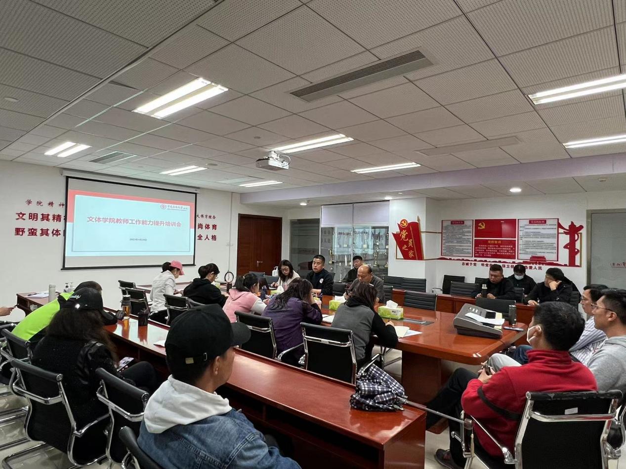 4月28日下午,文体学院在主楼A922召开教师能力提升工作培训会议,学院领导班子成员和全体教职工参加会议。会议由学院院长唐亮主持。